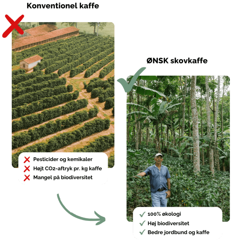 Resultatet er velnærede kaffeplanter, et økosystem i balance og en kaffeskov, der kan binde op til 53 ton CO2 pr. ha. Det er 5 gange så meget som en konventionel kaffemark.