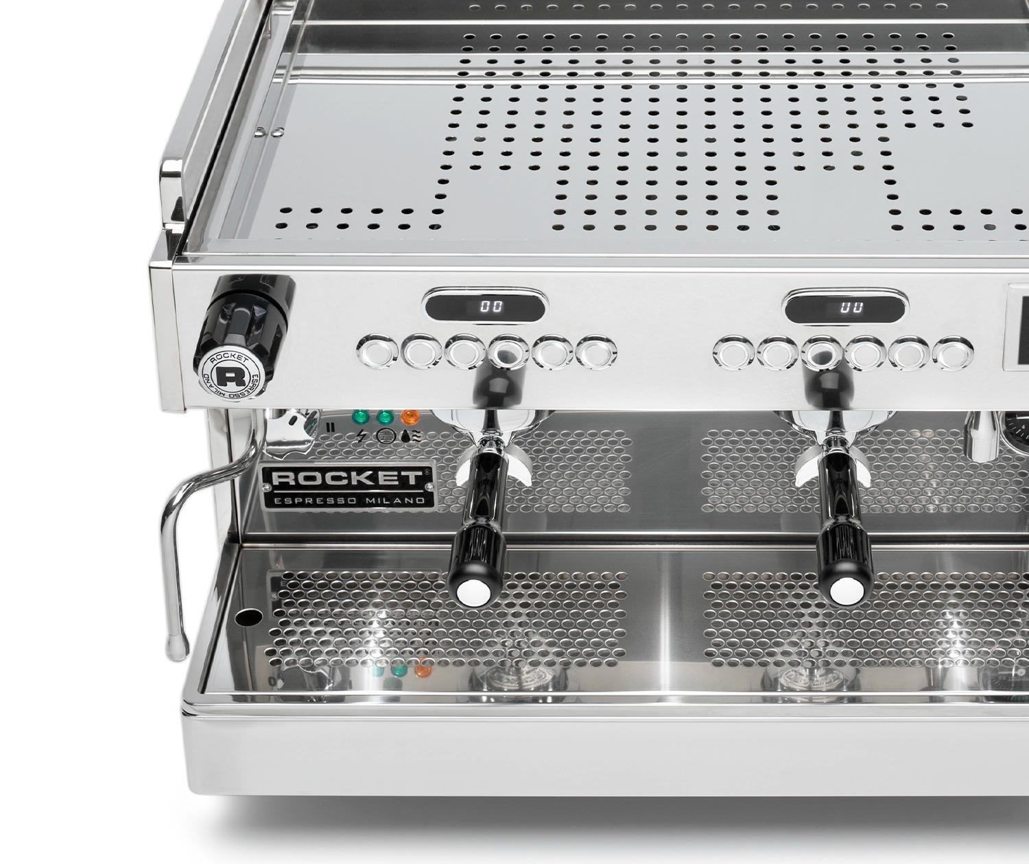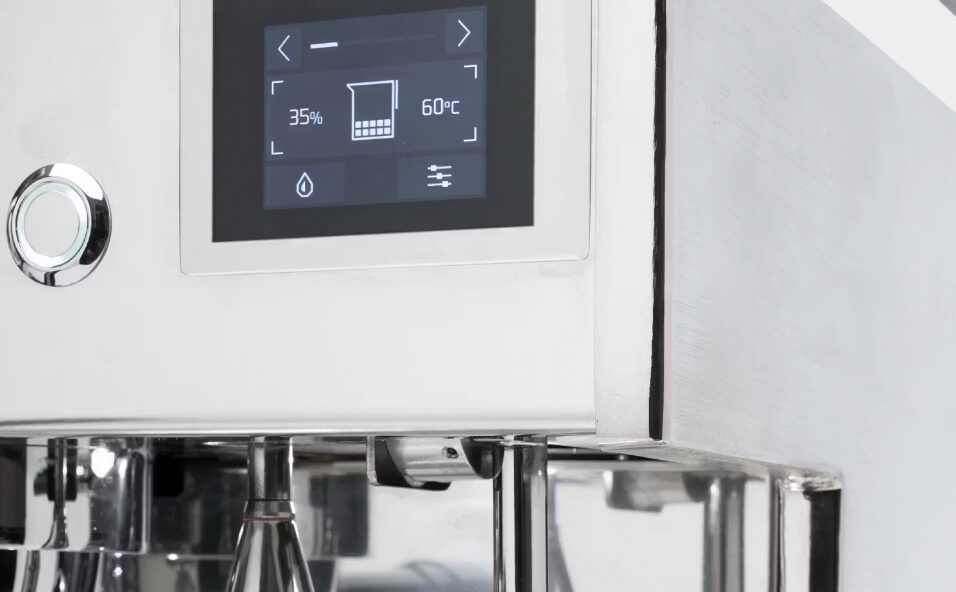 Den volumetriske dosering med digitalt display og shot-timer giver præcis kontrol over hver enkelt espresso, mens de elegante trykknapper i rustfrit stål med integreret LED-belysning gør betjeningen både intuitiv og stilfuld.